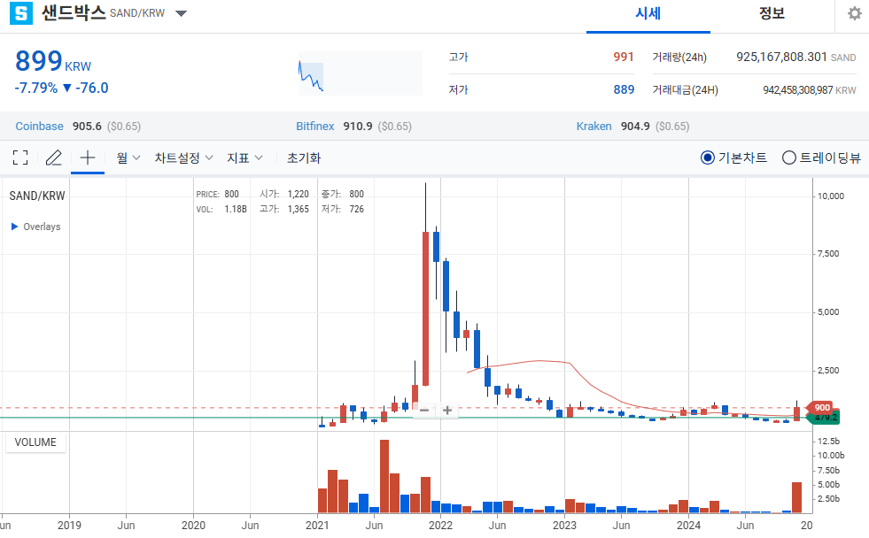 가격: 2024년 11월 현재, SAND는 약 $0.27(약 370원) 수준으로, 메타버스와 NFT 시장의 회복 가능성에 따라 장기적인 성장이 기대됩니다
