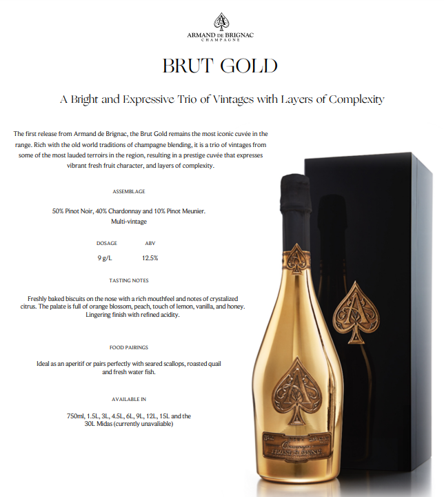 Armand de Brignac의 첫 번째 출시인 Brut Gold는 여전히 세계에서 가장 상징적인 퀴베로 남아 있습니다.