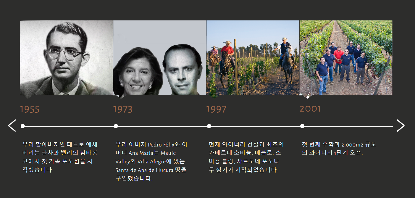 우리는 100% 가족 와이너리로, 1955년부터 칠레 와인 산업을 믿었던 프랑스 농학자이자 할아버지인 페드로 에체베리의 꿈을 이어가고자 합니다.
