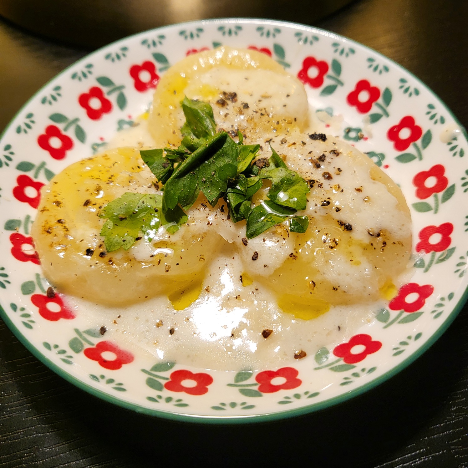 접시에 뇨끼를 예쁘게 담고 이탈리아 파슬리나 어린잎, 레지아노 치즈, 후추를 뿌려주세요.
