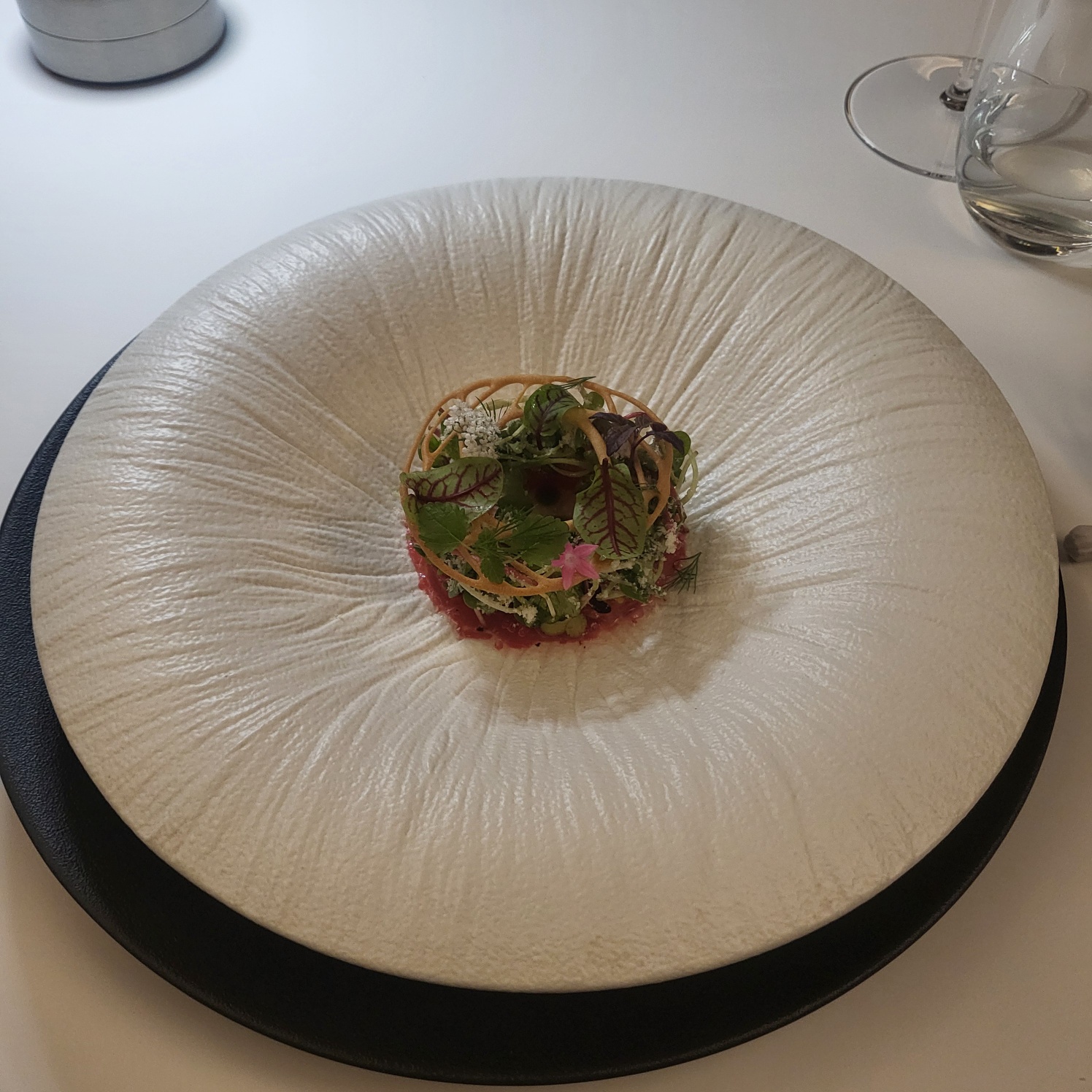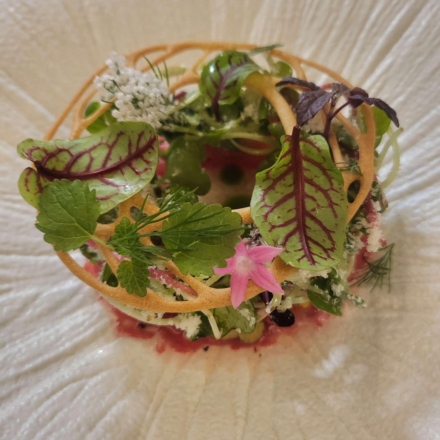어린잎채소, 케이퍼, 잣, 사보라 머스타드, 방울토마토 피클, 민트오일, 헤이즐넛 튀일