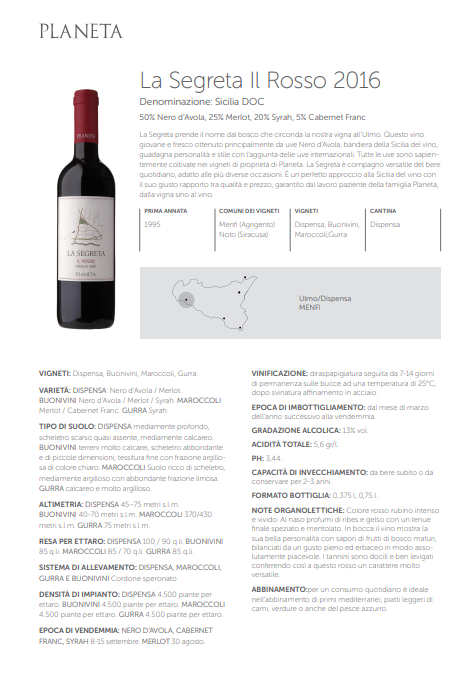 플라네타는 가족경영 와이너리다. 비슷비슷한 와인을 대량생산하는 것이 아니라 6개의 소규모 부티크 와이너리를 두고 각 떼루아의 개성을 섬세하게 표현한 와인들을 생산하고 있다. 시칠리아 서쪽 멘피(Menfi)에서 양조를 시작해 현재는 노또(Noto), 에트나(Etna), 비또리아(Vittoria), 카포 밀라쪼(Capo Milazzo) 등 시칠리아 다섯 군데의 주요 생산지에서 직접 포도밭을 일구고 와인을 양조한다. 설립 당시의 모토가 ‘시칠리아 와인의 재조명’이었다면, 현재는 시칠리아 곳곳의 서로 다른 떼루아, 각각의 개성을 섬세하게 표현하는 것에 집중하고 있다.