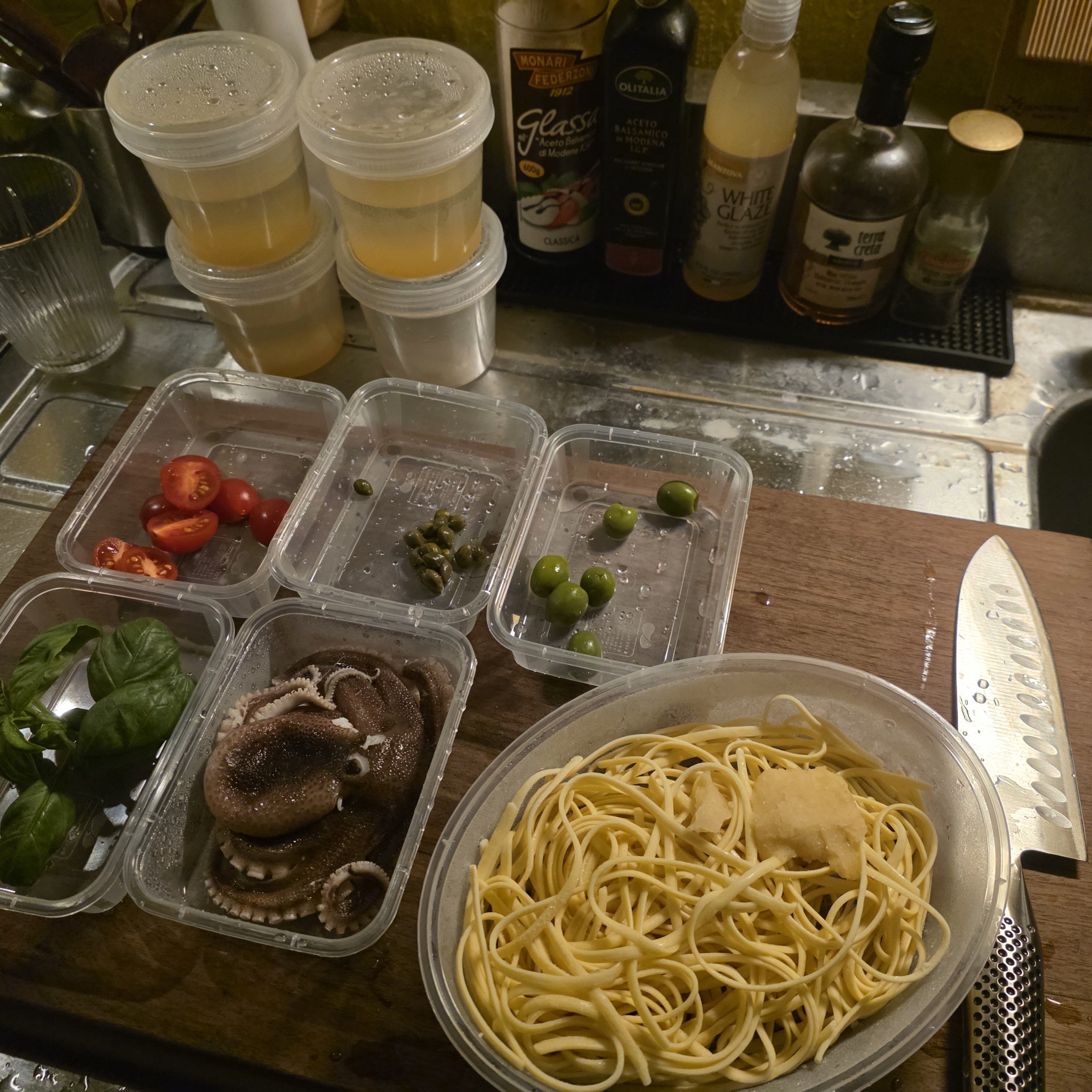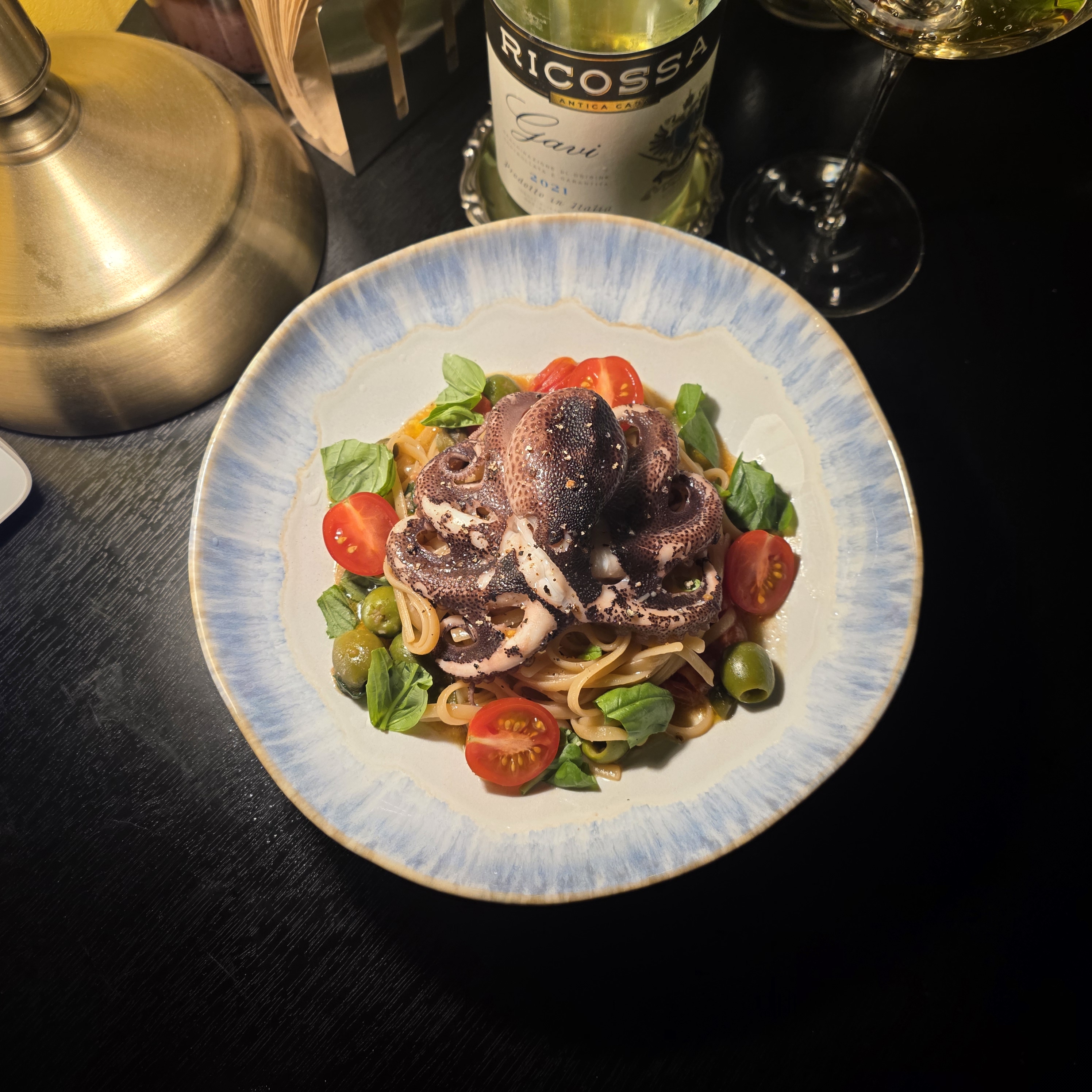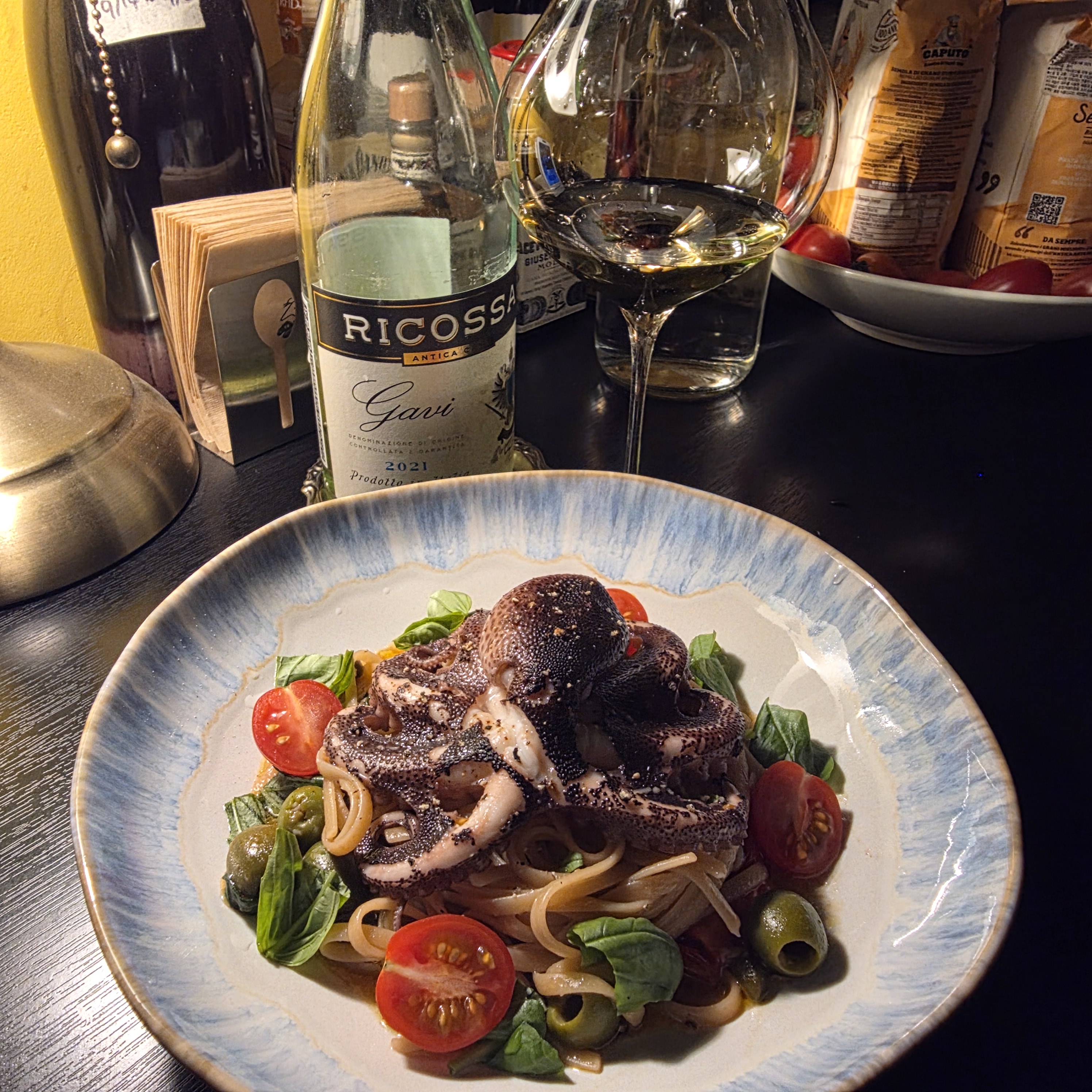 방울토마토, 케이퍼, 올리브, 바질, 쭈꾸미 100g, 링귀니 파스타, 갈릭퓨레입니다