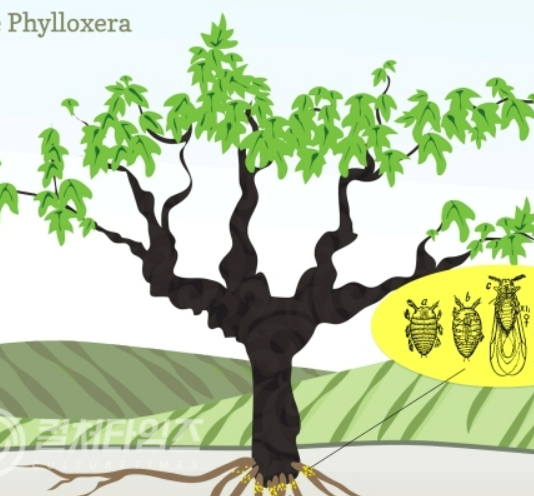 필록세라 바스타트릭스(PLANCHON)는 포도나무 뿌리계통에 파괴적인 진딧물이며, 유럽에서 접목된 식물을 주로 사용하는 이유입니다. 이 해충은 대부분의 포도나무 품종이 이에 대한 면역력을 발달시킨 미국이 원산지입니다. 유럽에서는 1850-60년경에 처음 등장했으며, 포도나무의 주요 적 중 하나입니다. 곤충은 식물의 뿌리와 잎을 먹습니다. 뿌리와 때로는 잎에 혹이 나타나기 때문에 필록세라를 알아볼 수 있습니다. 해충이 식물의 뿌리 체계를 완전히 파괴할 수 있기 때문에, 뿌리 손상은 치명적입니다. 유럽 품종에 대한 유일한 관리 조치는 미국 대목에 접목하는 것인데, 미국 품종의 일부는 진딧물에 저항성이 있기 때문입니다