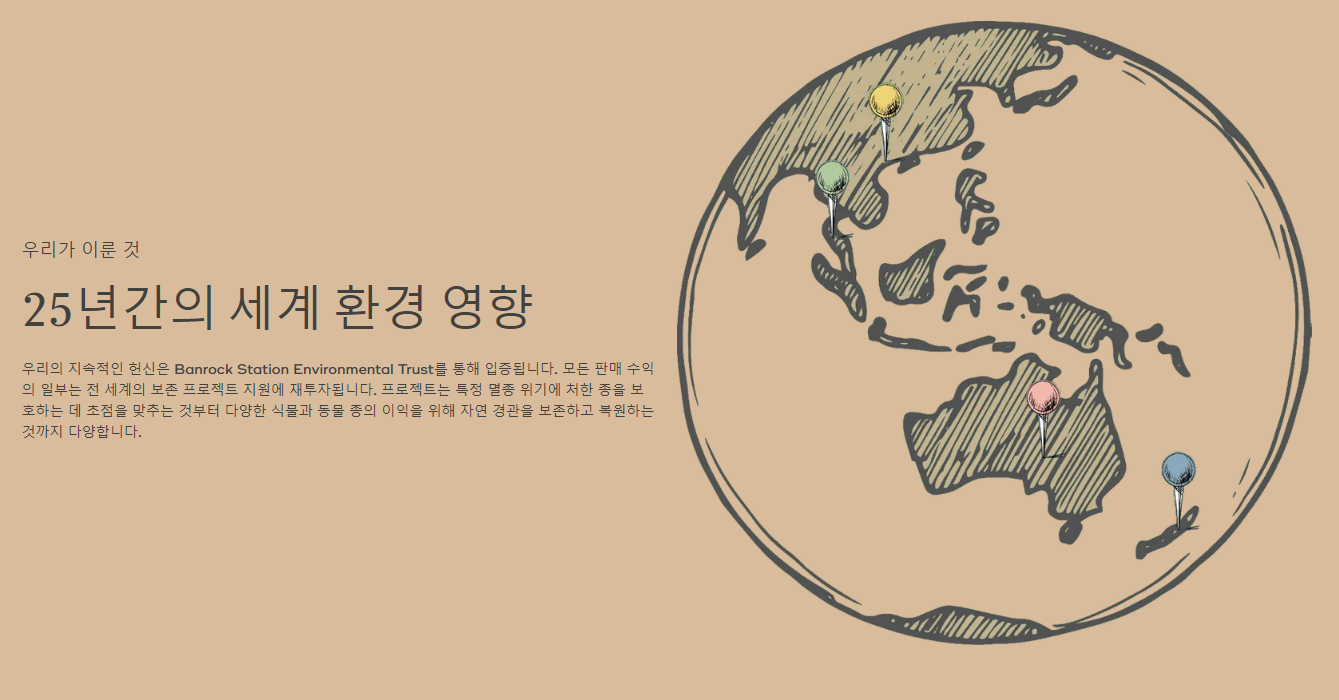 지난 20년 동안 우리는 리버랜드의 습지를 유지하는 것부터 그레이트 배리어 리프의 거북이를 보호하는 것, 북극곰과 오랑우탄의 재활을 지원하는 것까지 13개국에서 130개 이상의 프로젝트에 기여했으며, 여러분과 환경에 중요한 대의를 계속 지원하고 있습니다. Landcare Australia와 협력하기로 한 가장 최근의 약속은 매년 100,000그루의 토종 나무와 관목을 심는 결과를 가져올 것입니다. 우리는 이 지구를 보존하기 위해 750만 달러를 겸손하게 기부했습니다! 하지만 우리는 거기서 멈추지 않습니다. 우리는 진심으로 믿기 때문입니다... 모든 한 방울이 중요합니다.