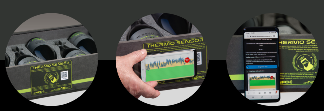 NFC* 칩 리더기가 있는 스마트폰을 케이스 측면에 부착된 스티커 위에 놓으면 Laurent Ponsot SAS에서 생산한 각 "지능형 케이스"의 온도 데이터에 직접 액세스할 수 있습니다.