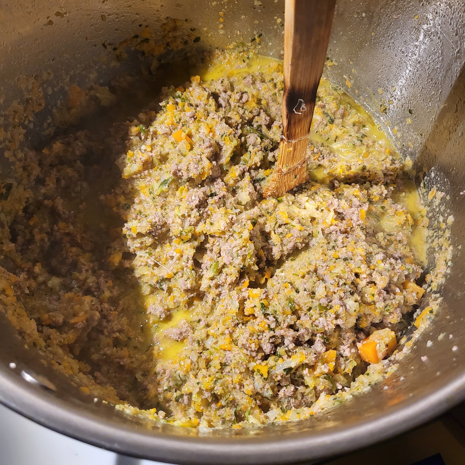 3. 볶기: 큰 팬이나 웍에 식용유를 약간 두르고, 양파, 당근, 샐러리를 볶아줍니다. 어느정도 숨이 죽으면 핸드블랜더로 조금씩 더 잘게 만들어줍니다.