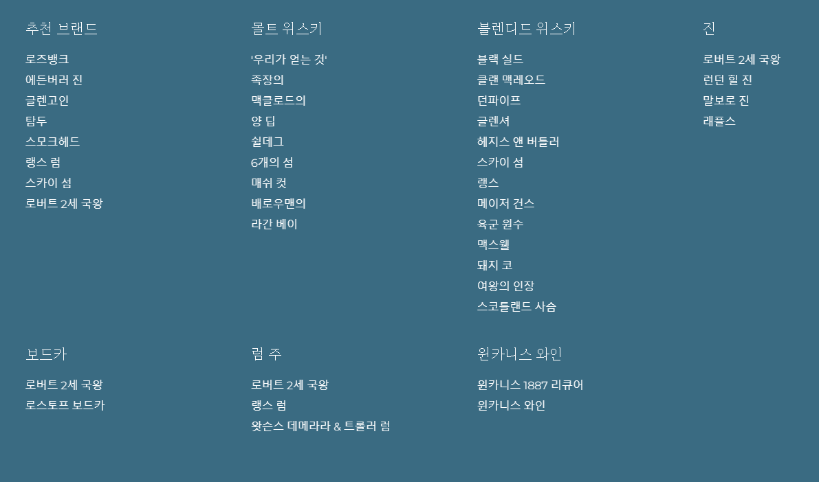 보드카, 럼, 몰트위스키, 블랜디드 위스키, 진, 와인