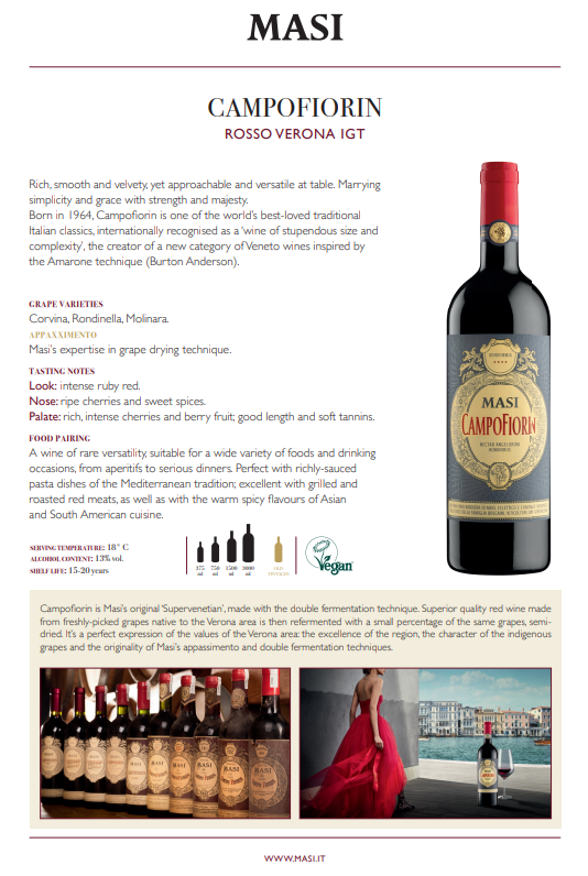 마시(Masi)는 와인에서 최대한의 음용성과 균형을 추구하면서 1980년대에 원래 기술을 개량하여 현대 캄포피오린(Camofiorin)을 생산하는 데 사용되는 '이중 발효' 공정으로 발전시켰습니다. 와인은 신선하게 발효한 코르비나(Corvina), 론디넬라(Rondinella), 몰리나라(Molinara) 포도로 만든 다음, 아마론(Amarone) 생산에 사용되지 않은 동일한 품종의 통째 반건조 포도 30%로 재발효합니다. 그 결과 색상, 추출물, 향, 향수가 더욱 풍부해지고 알코올 함량이 증가하며, 더 부드럽고 정제된 타닌이 결합됩니다.