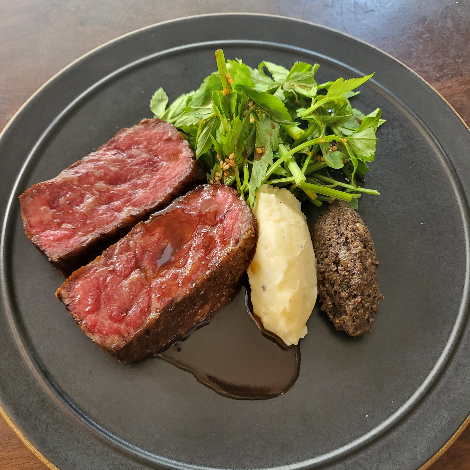 Korean beef juice sauce, potato puree, king oyster mushroom duxelles 99.