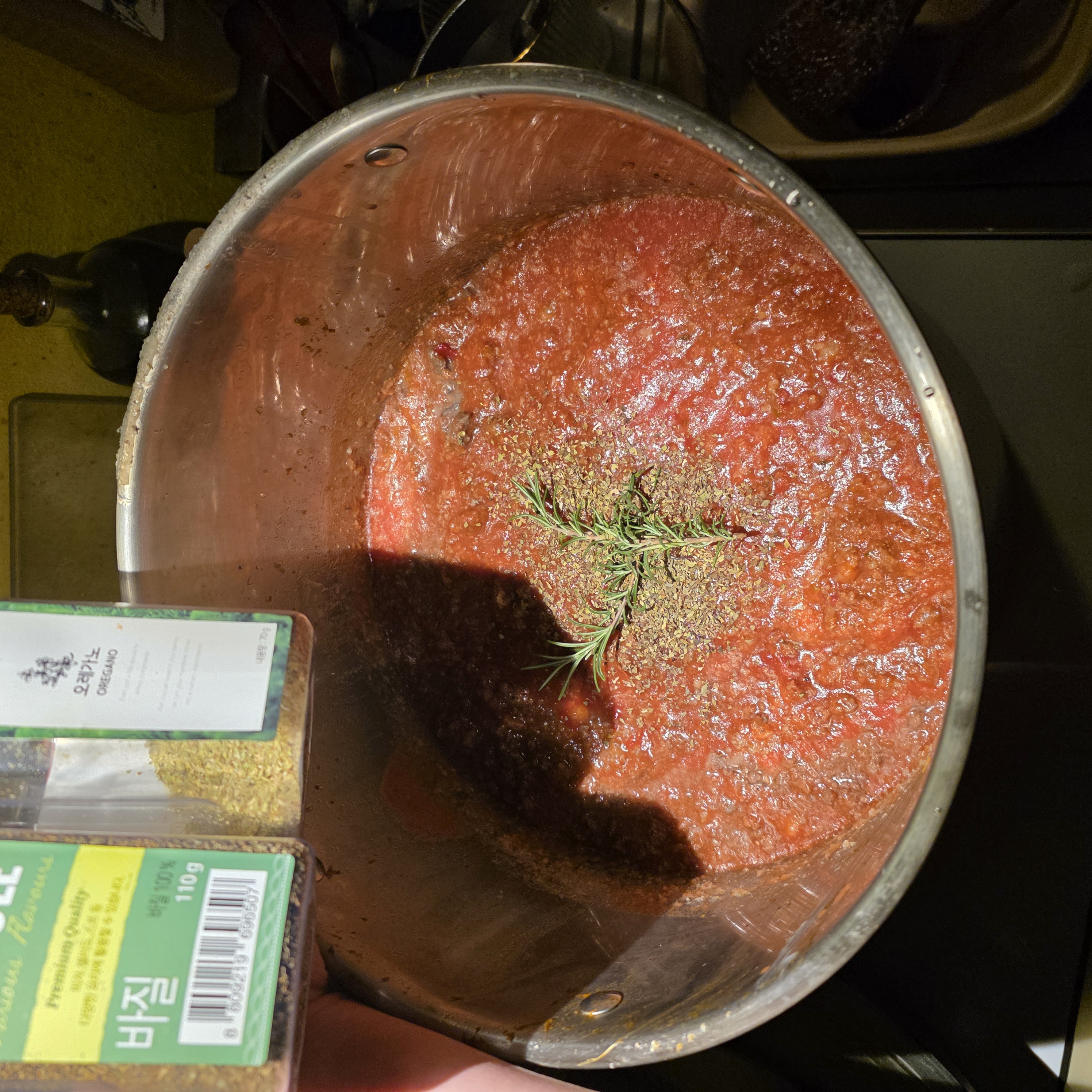 다음으로 바질과 오레가노, 로즈메리를 넣고 소스에 허브의 향을 더해주세요