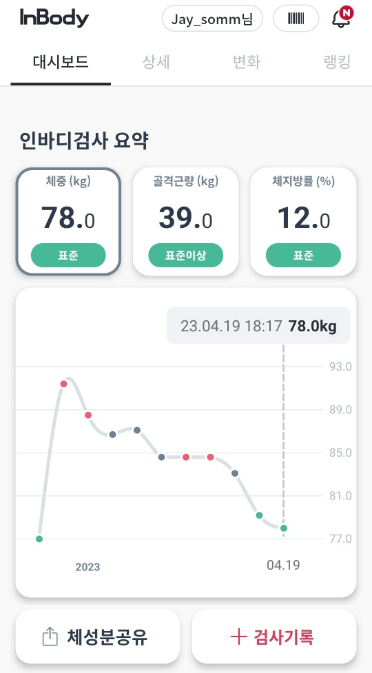23.04.19 체중 78.0kg, 골격근량 39.0kg, 체지방률 12.0%