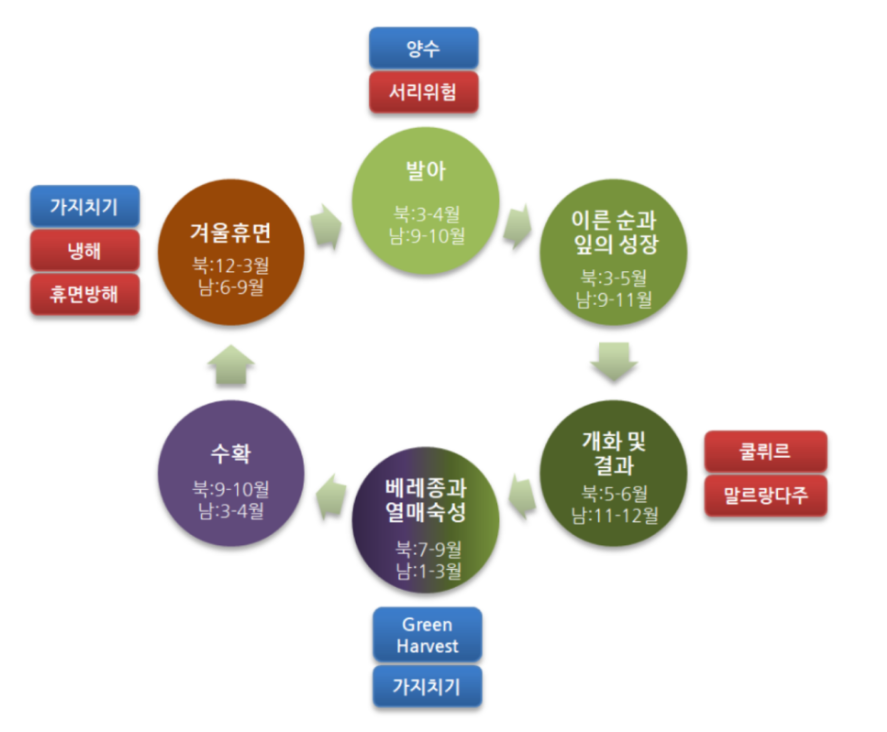 북반구를 기준으로 포도밭이 매월 어떤과정을 통해 관리되고 와인이 만들어지는지에 대해 중요한 사항들을 정리해보았다.