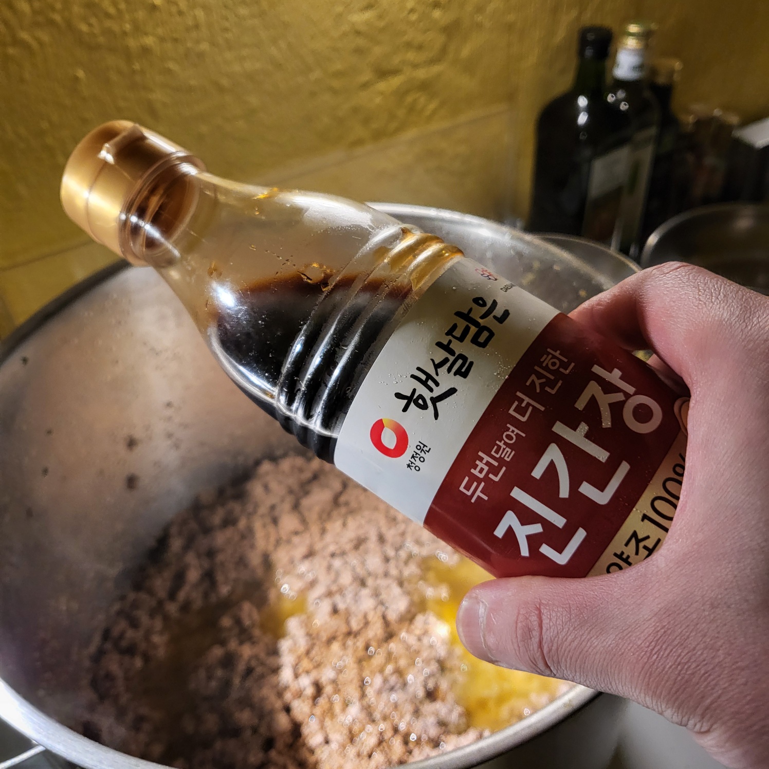 6. 미리 볶아둔 양파, 당근, 샐러리를 고기와 함께 넣어서 간장을 넣어서 간을 맞춰줍니다.
