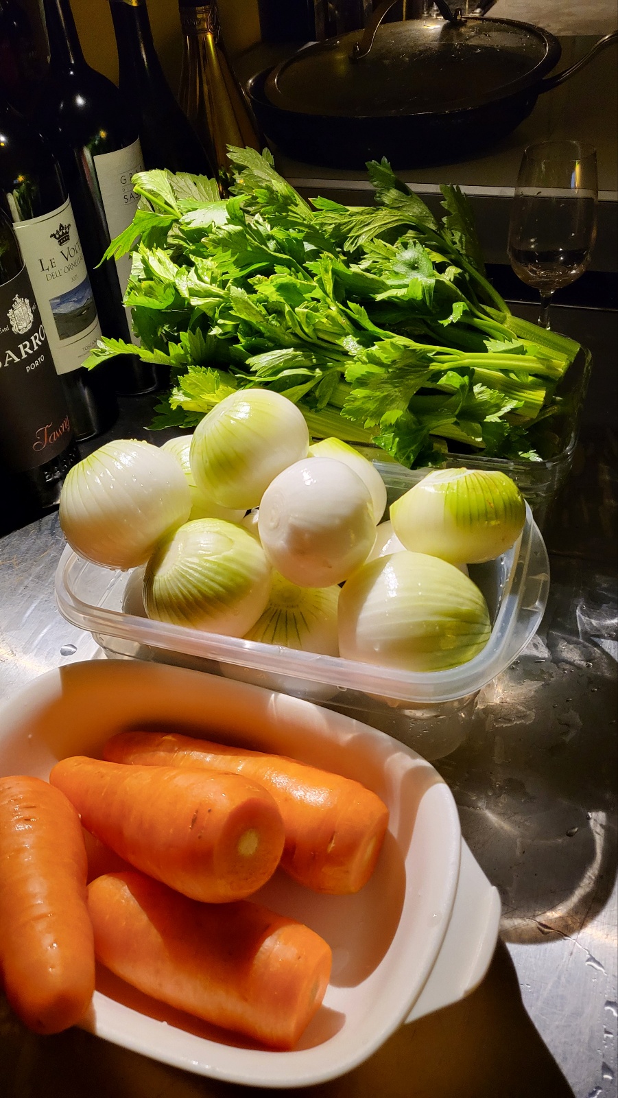 2. 양파, 당근, 샐러리를 손질하여 준비합니다.