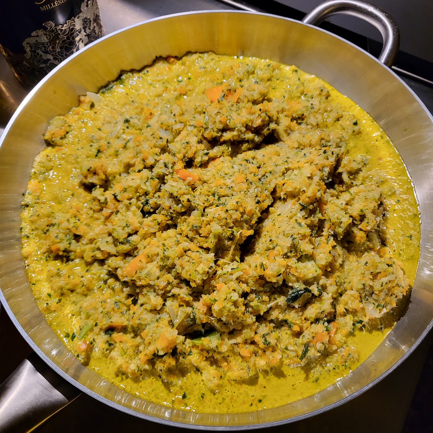 3. 볶기: 큰 팬이나 웍에 식용유를 약간 두르고, 양파, 당근, 샐러리를 볶아줍니다. 어느정도 숨이 죽으면 핸드블랜더로 조금씩 더 잘게 만들어줍니다.