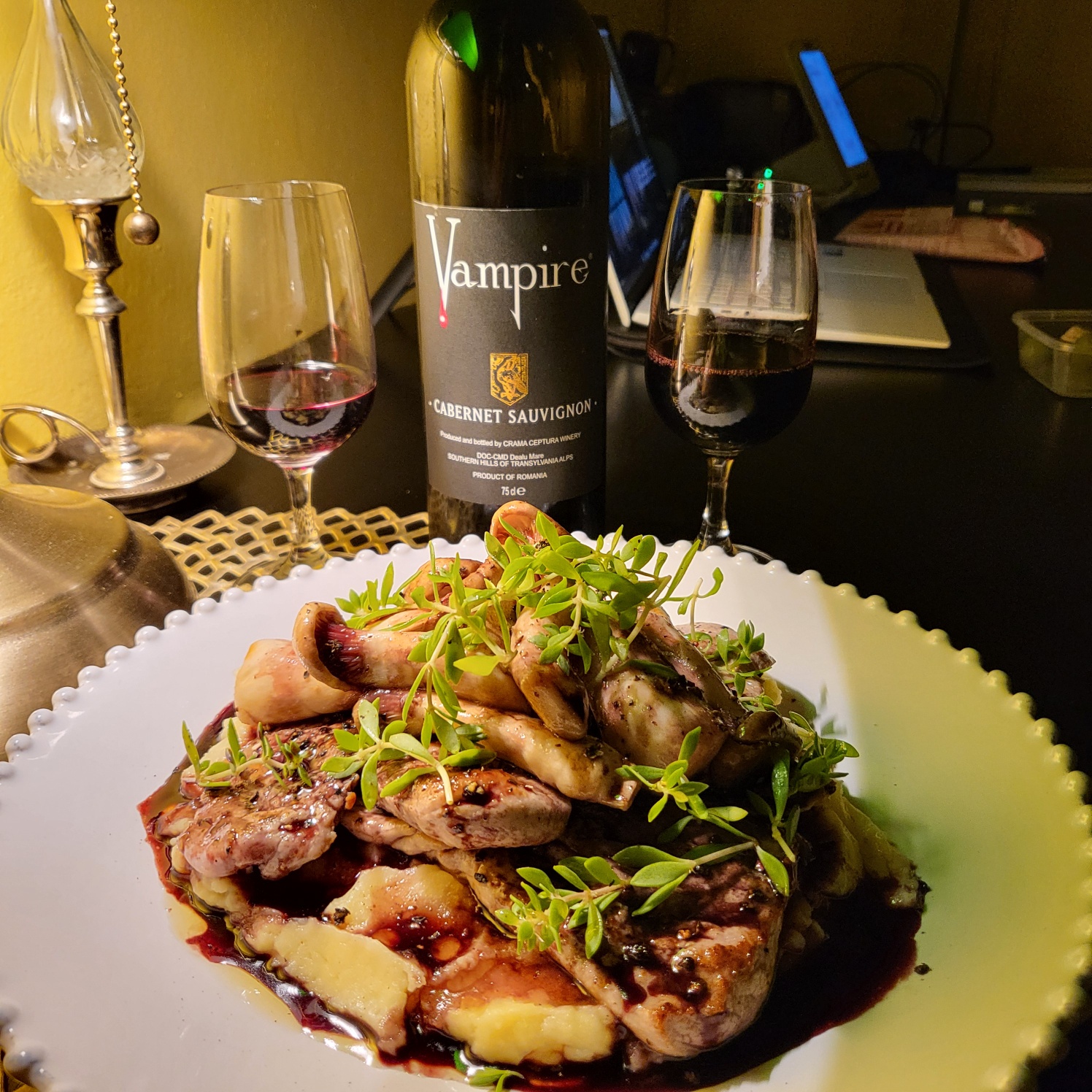 매쉬드 포테이토를 접시에 담은뒤 구운 고기와 버섯을 올린 후에