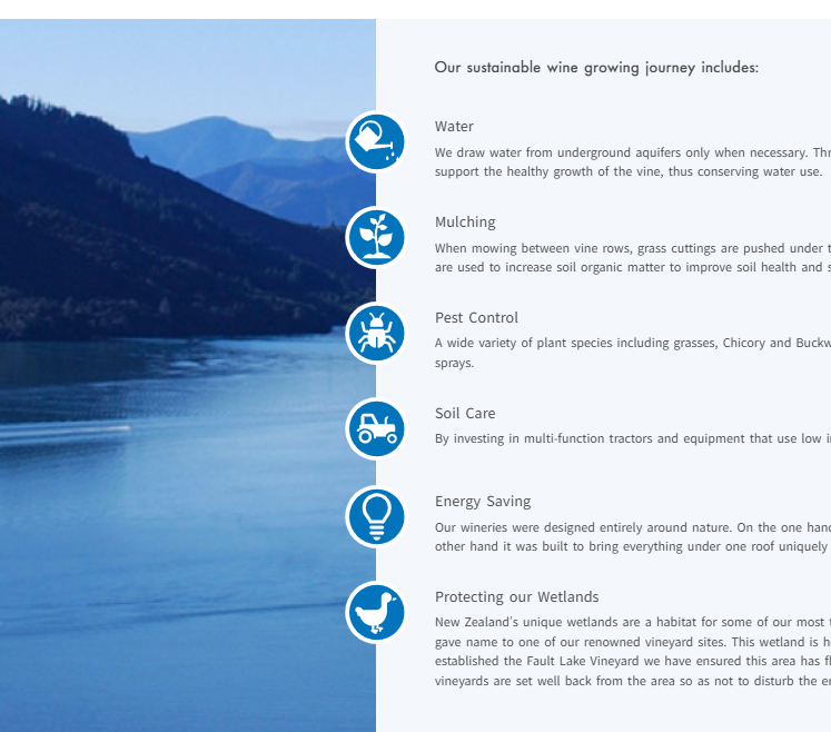 말버러와 호크스 베이 포도원에서의 지속 가능성 관행은 이 위대한 와인 생산 지역의 토양과 물을 우리가 신성하게 여기는 것을 반영합니다.
