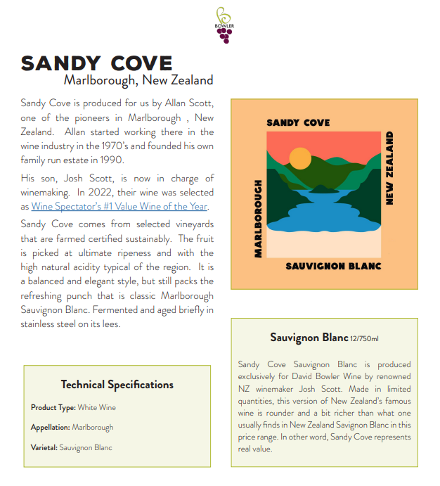 Sandy Cove Sauvignon Blanc은 유명한 NZ 와인메이커 Josh Scott이 David Bowler Wine을 위해 독점적으로 생산합니다. 한정 수량으로 생산되며... 뉴질랜드